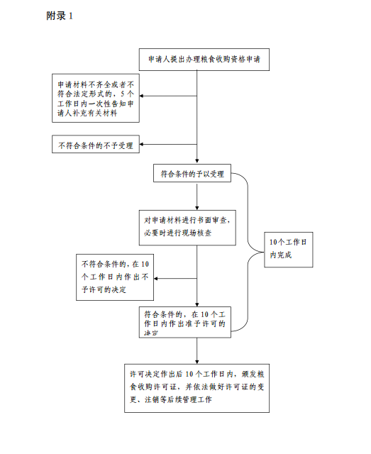 (一)收到申请人提出办理粮食收购资格申请后,符合条件的予以受理;申请材料不齐全或者不符合法定形式的,5个工作日内一次性告知申请人补充有关材料;不符合条件的不予受理。